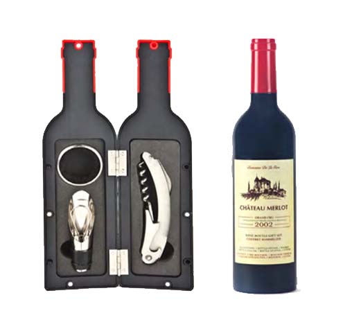 מארז אביזרי יין במעמד בצורת בקבוק. המארז כולל פותחן, משפך, טבעת לצוואר הבקבוק. מגיע באריזת מתנה.